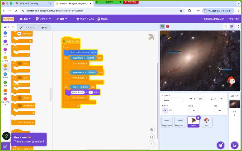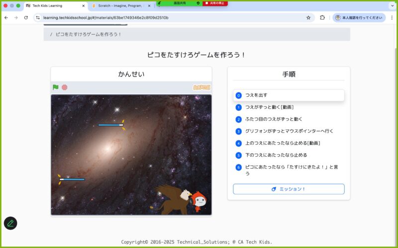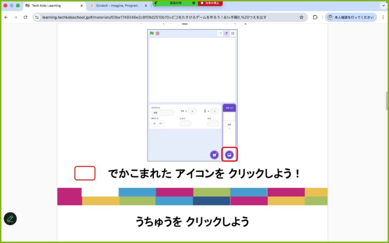 息子は初めての体験なので、先生のお手本を見ながら取り組んでいます。その後タブレットでScratchのプログラミングへ。今回は「アミダくじ」の動きを作る内容でした。かわいいキャラクターたちがあみだくじを進んでいます。
