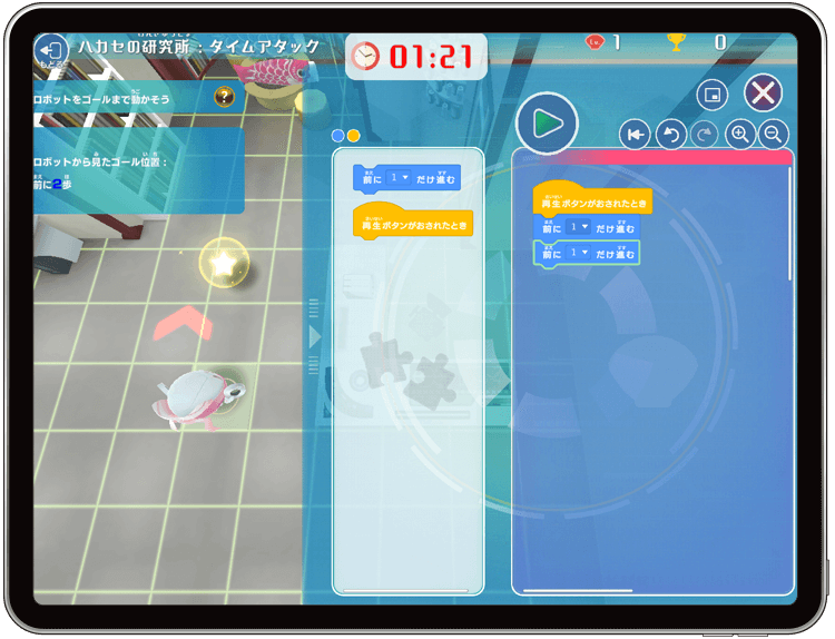 パズルのように冒険ステージをクリアしていく仕組みになっており、遊んでいるうちに実践的なコーディング力が自然と身につく設計になっています。