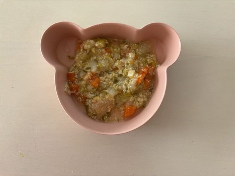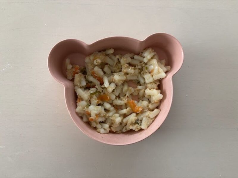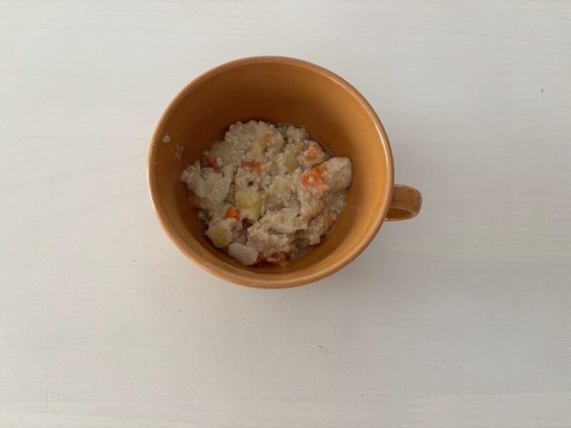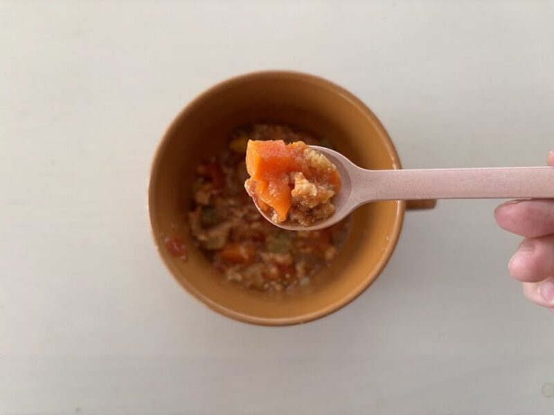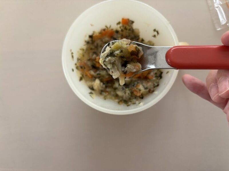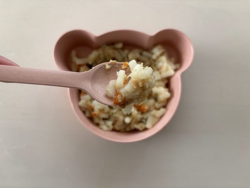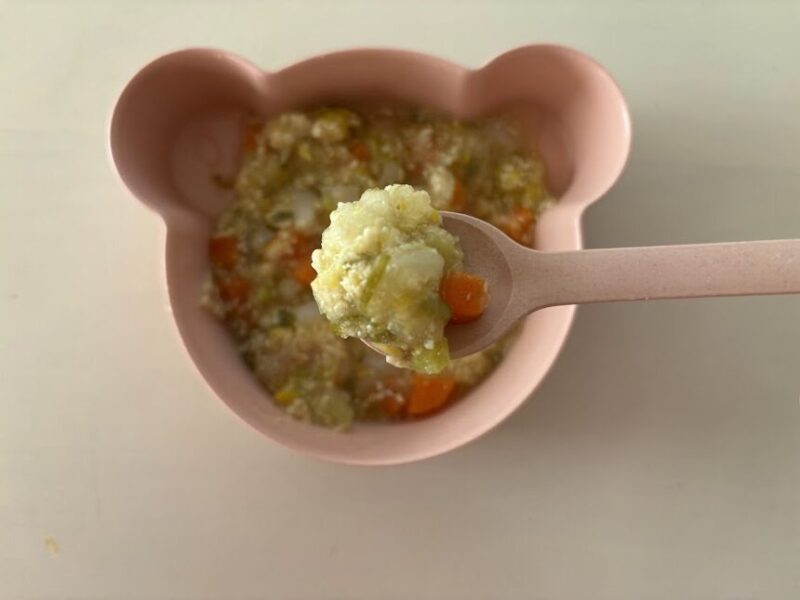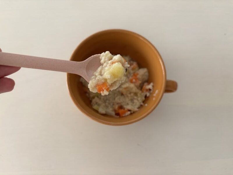鶏ガラだしでじっくり煮込まれており、ほどよいとろみで、離乳食後期でも食べやすい仕上がりです。